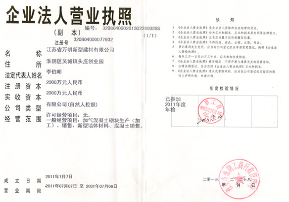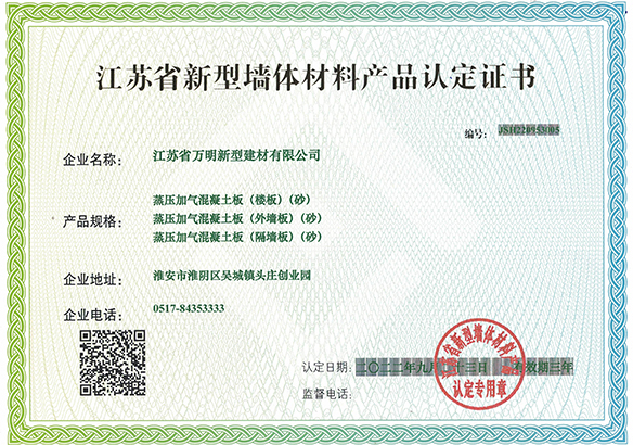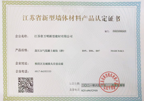 江蘇省萬(wàn)明新型建材有限公司是一家多元化經(jīng)營(yíng)企業(yè),專(zhuān)業(yè)生產(chǎn)新型墻體材料、蒸壓砂加氣砌塊、蒸壓灰加氣砌塊、混凝土砌塊銷(xiāo)售。本公司所生產(chǎn)的新型墻體材料、蒸壓砂加氣砌塊、蒸壓灰加氣酥塊、混凝土砌塊填補(bǔ)了江蘇省企業(yè)市場(chǎng)空白,產(chǎn)品質(zhì)量符合標(biāo)準(zhǔn),并被江蘇省墻體材料改革辦公室認(rèn)定為綠色新型墻體材料,是江蘇具活力的企業(yè)之一。